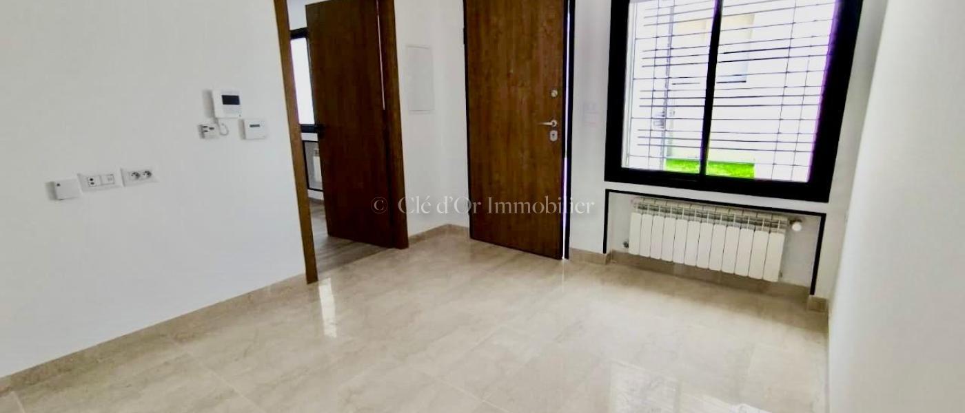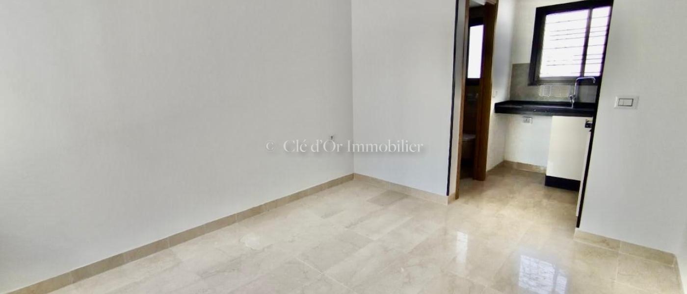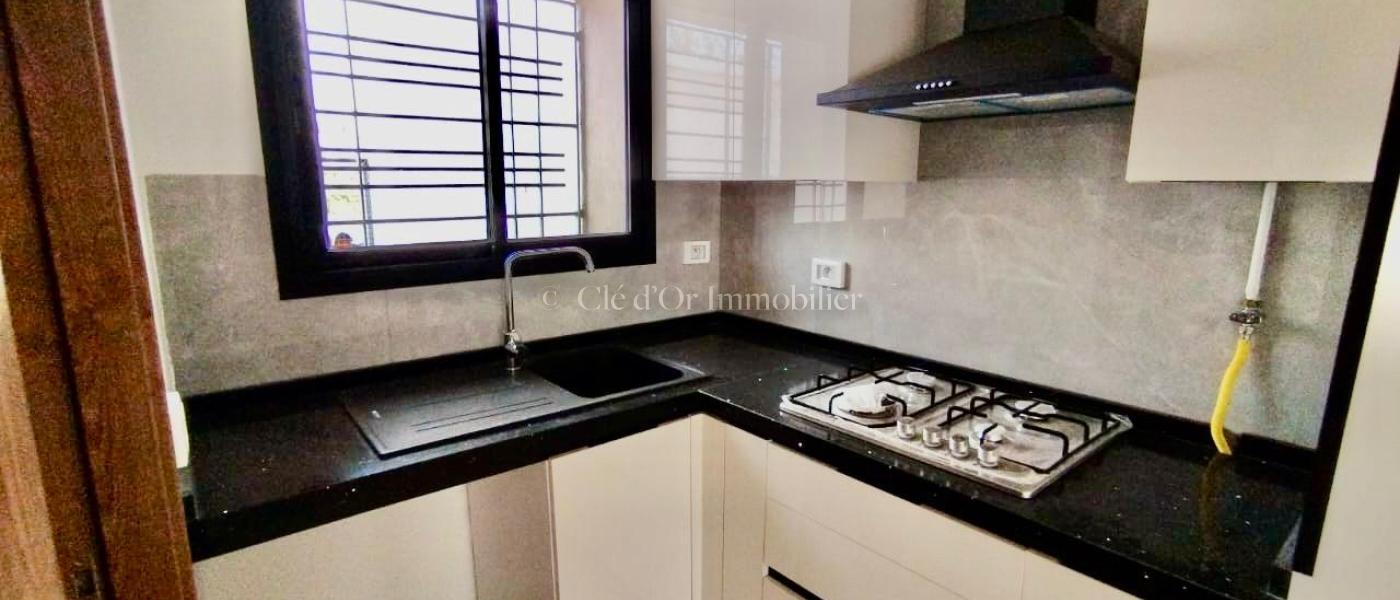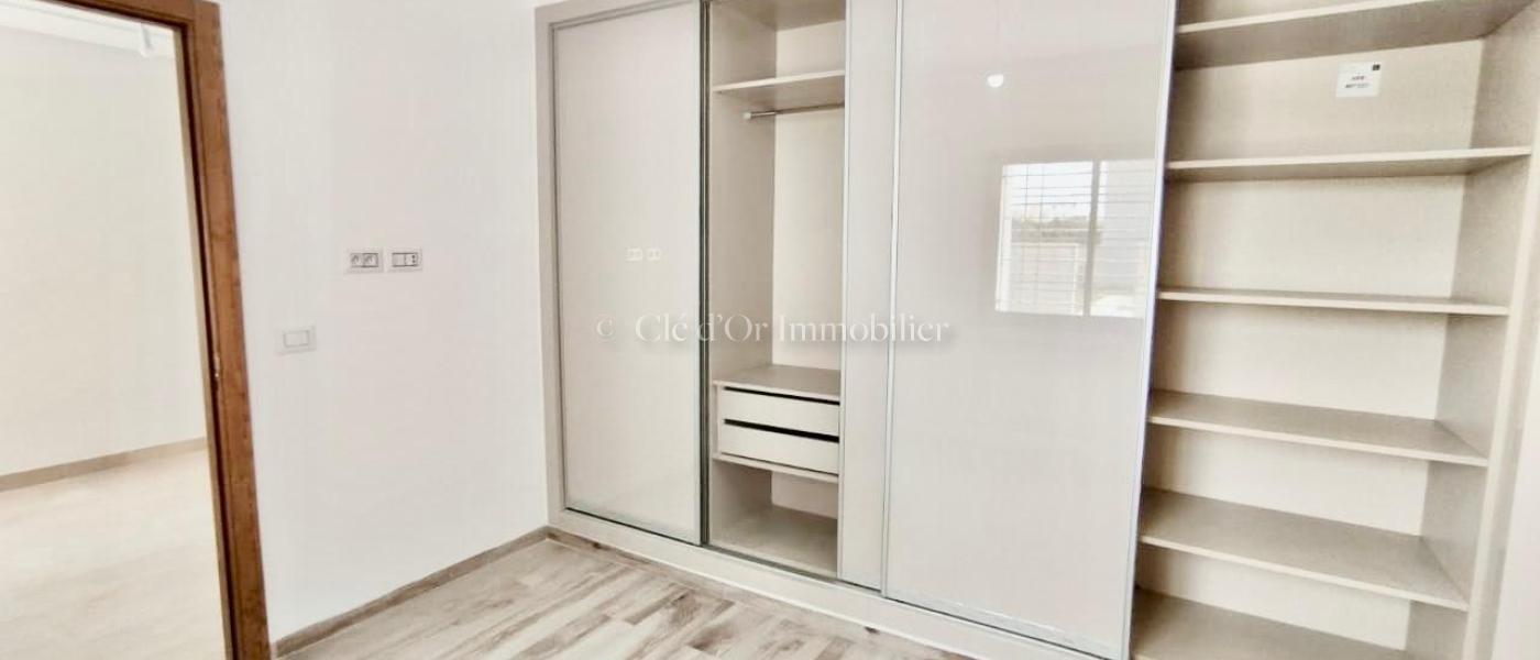 Location d'un appart s1 jamais habité au RDC aux jardins de carthage. A l'entrée, on trouve un salon avec un jardin, une kitchenette équipée d'une hotte aspirante, d'une plaque de cuisson et d'un four électrique, une chambre à coucher avec un dressing et une salle de douche.